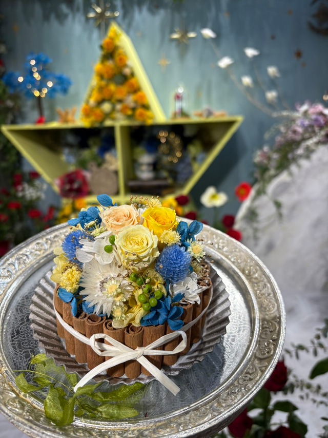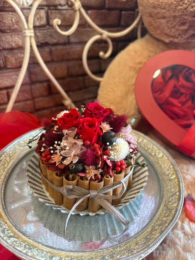 シナモンを使った可愛らしいタルトケーキ型のアレンジです。 たくさんの小花がギュッと詰まった中にあるプリザーブドフラワーのバラが目を惹きます。 バレンタインの贈り物やホワイトデーのお返しにはもちろん、ご自宅のインテリアとしてもオススメです。 限定商品のためなくなり次第終了となります。 商品サイズ:タルトの直径:約11cm 【 プリザーブドフラワーのお取り扱いについて】 ・水やりの必要はありません。 ・直射日光、高温多湿は避けて下さい。 色褪せ、花びら切れの原因になります。 ・衣類、床、壁に直接触れると色移りする可能性がございますのでご注意ください。
