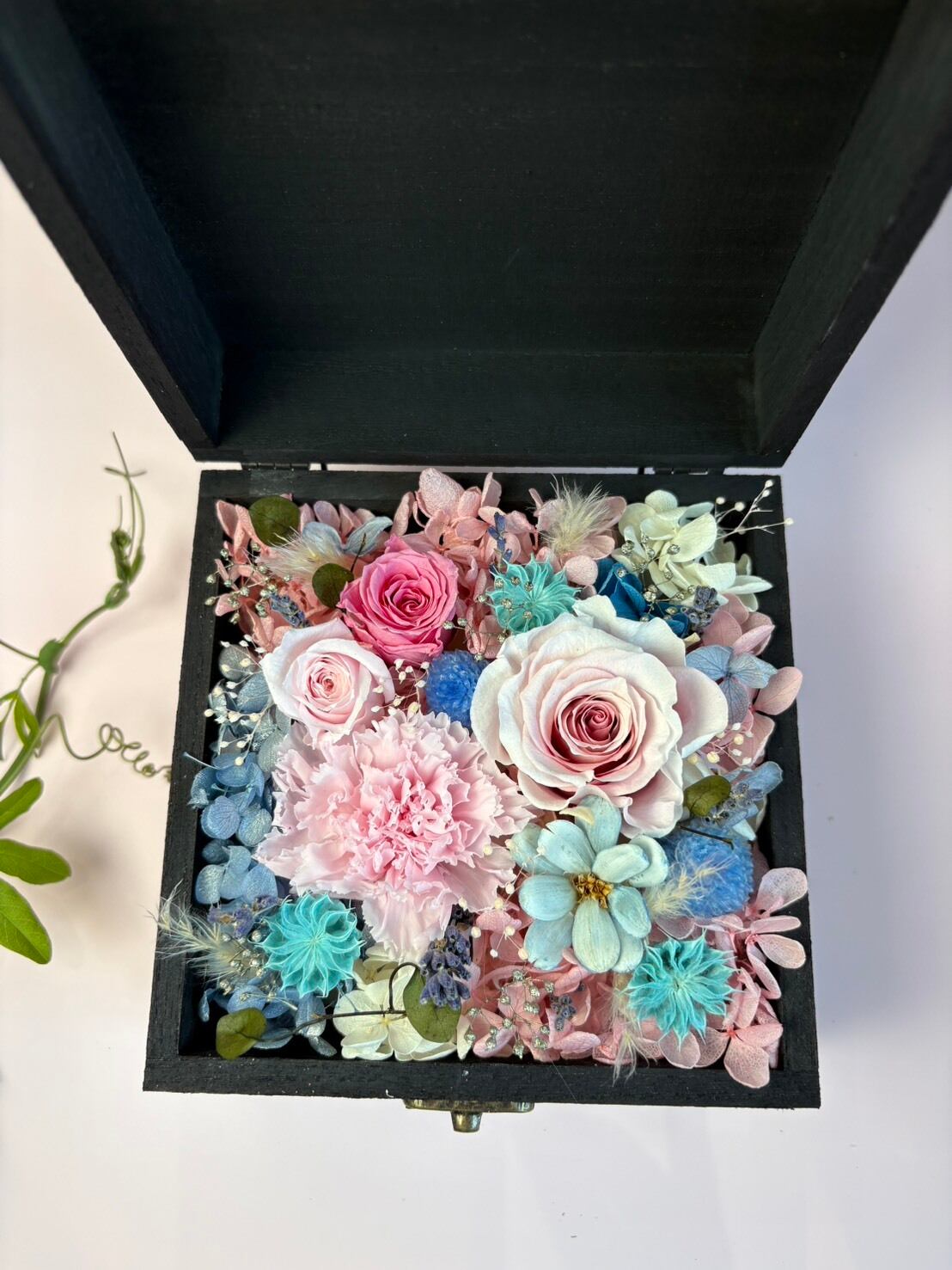 アンティークボックスを開けると、華やかな花々がぎゅっと詰まった特別なプリザーブドフラワーアレンジです。
