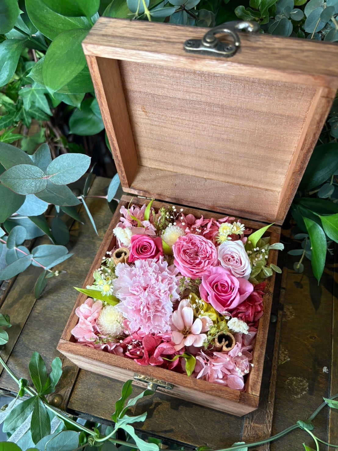 アンティークボックスを開けると、華やかな花々がぎゅっと詰まった特別なプリザーブドフラワーアレンジです。