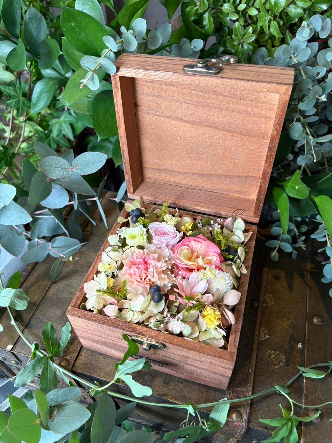アンティークボックスを開けると、華やかな花々がぎゅっと詰まった特別なプリザーブドフラワーアレンジです。