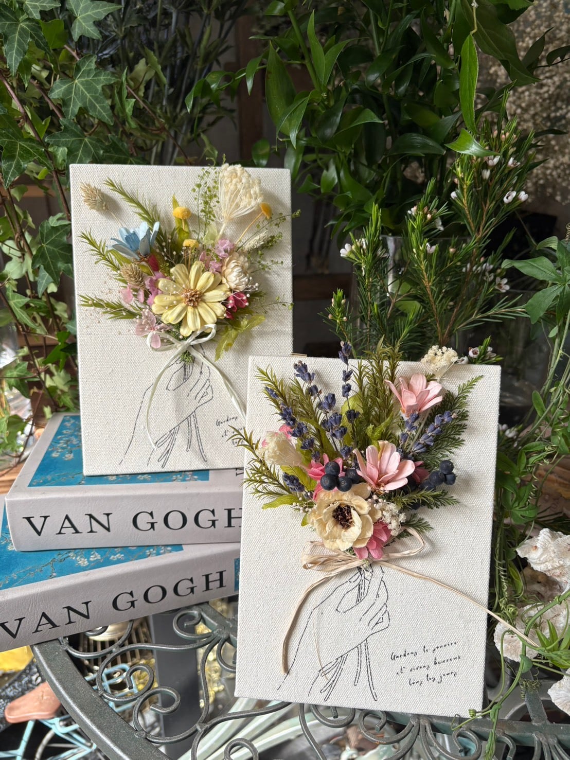 ナチュラルなキャンバスに、繊細なドライフラワーやプリザーブドフラワーを束ねたようにあしらったボードアレンジ。